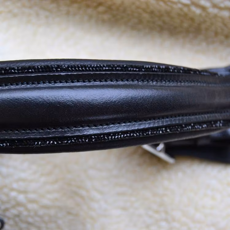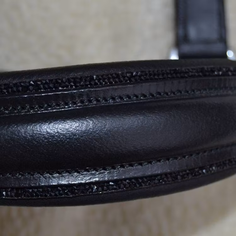 Svart anatomisk lädergrimma med svart strass. Snabbknäppen och reglerbar på båda sidorna av nackstycket. Elegant svart lädergrimma med lyxig strass.