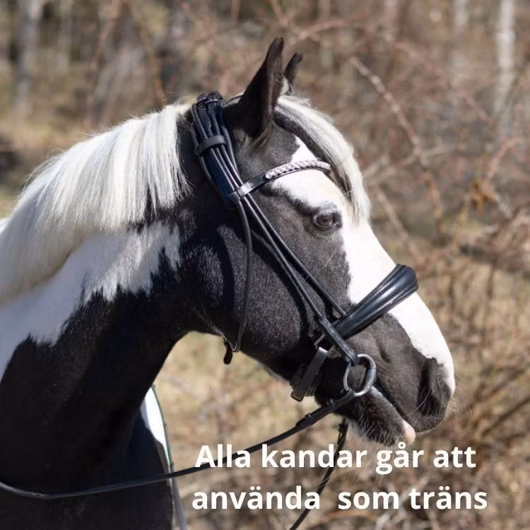 Ett kandar med rundsydda lädret ger ett mjukare och följsamt intryck jämfört med traditionellt platt läder - något som många dressyrryttare uppskattar. För den som inte vill ha ett svart rundsytt kandarträns har vi ett allternativ med brunt rundsytt kandar men samma nosgrimma men utan lackdetaljkant.