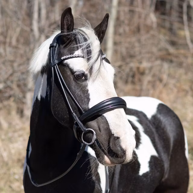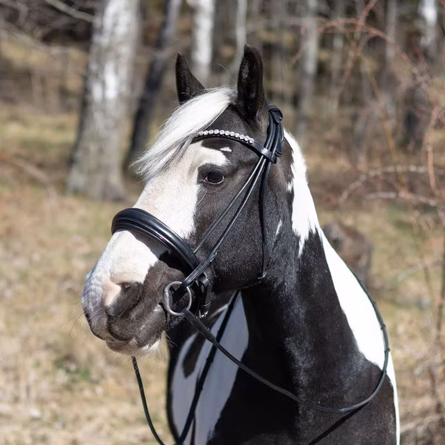 Nosgrimman är mjukt fodrad för att ge hästen en behaglig känsla utan att riskera att skapa ett stort tryck eller skav på hästens känsliga nosrygg. Nosgrimman stängs med pull back förslutning. På kandaret sitter ett otroligt fint pannbandet gnistrar otroligt fint och ger ett elegant intryck utan att bli för mycket.