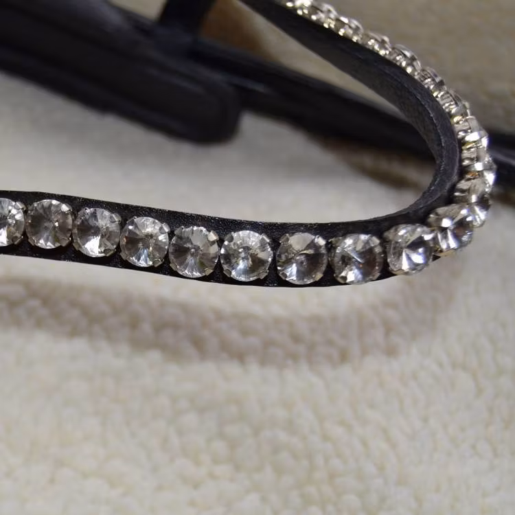 Mjukt nackstycke ger bästa passform och komfort för hästen. Den välfodrade nosgrimman och det glänsande strasspannbadet fulländar detta lyxiga kandar - perfekt för både träning och tävling.