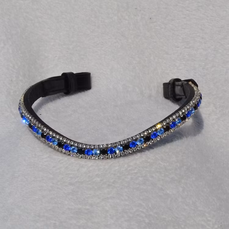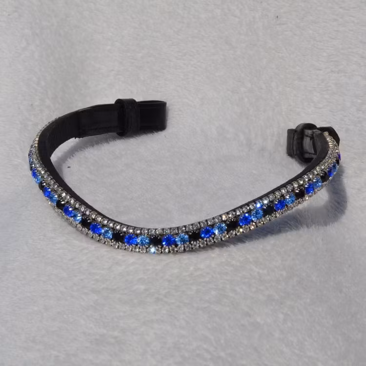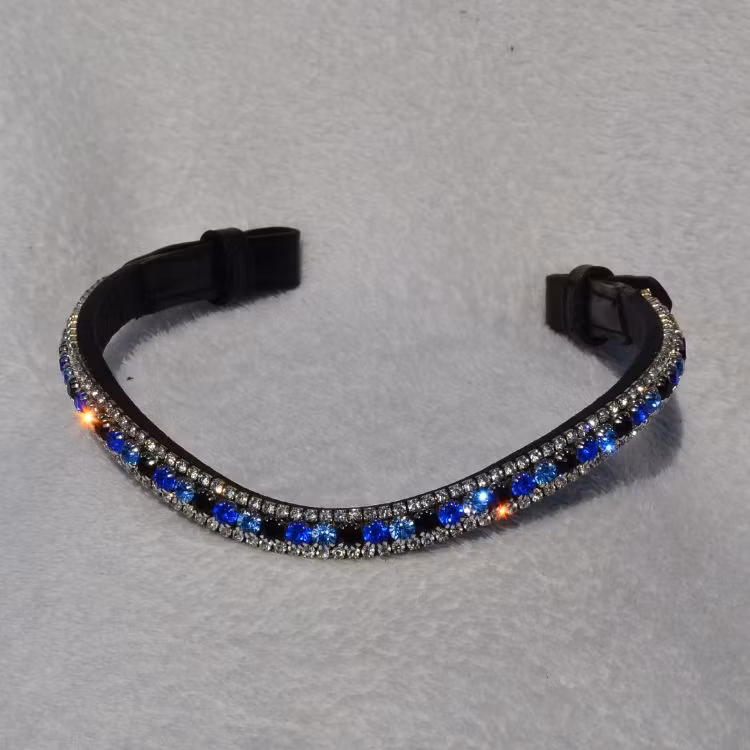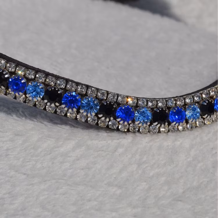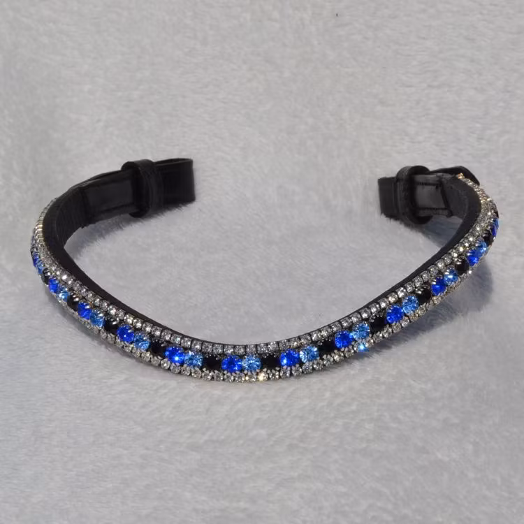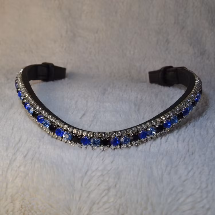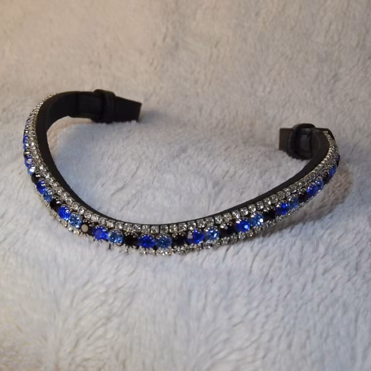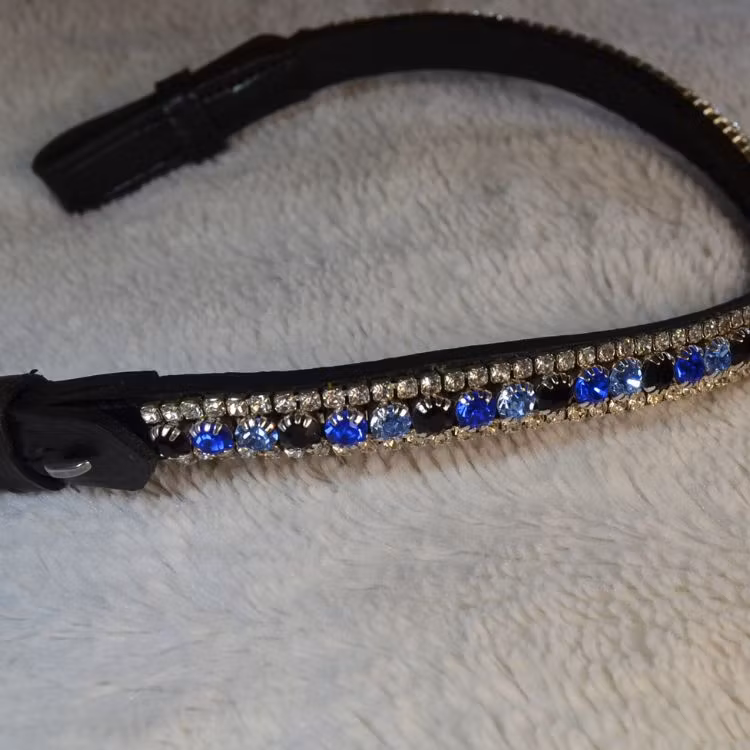 Mörkblått i kombination med vit stass gnistrar otroligt fint. Att man enkelt kan öppna sidorna med säkra snabbknäppen gör inte saker sämre. Du kan snabbt byta och ändra färg på tränset utan att behöva plocka isär det. Pannbandet finns i alla storlekar från häst (41,9cm), COB (39,3cm) och ponny (36,8cm).