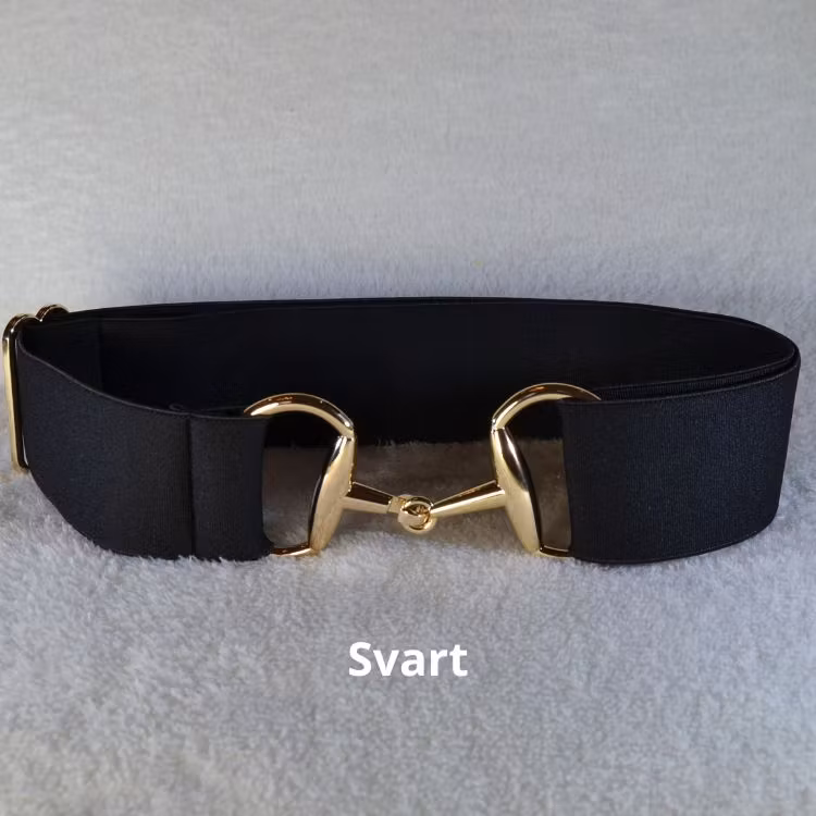 Välj mellan svart eller glittersvart resårskärp med hästbett. Storleken passar alla då det är one size skärp - det vill säga skärpet är tillverkat i resår som är ställbart till önskad längd. Skärpet öppnas och stängs enkelt med ett fint guldbett som ger skärpet en snygg detalj.