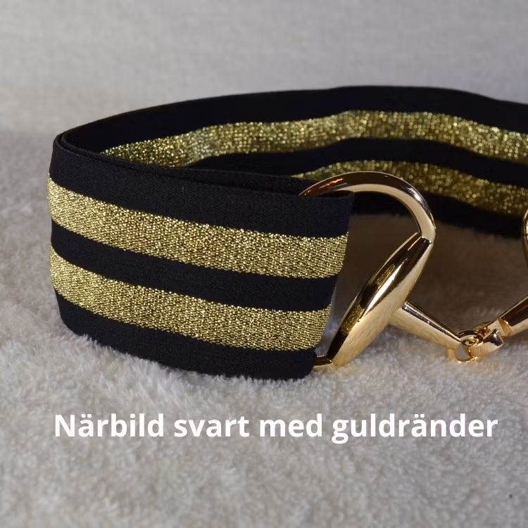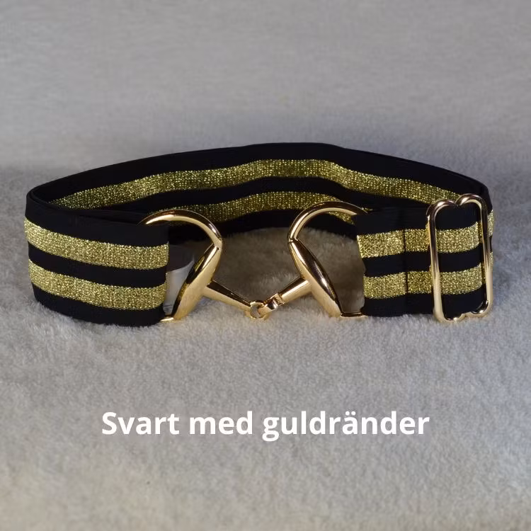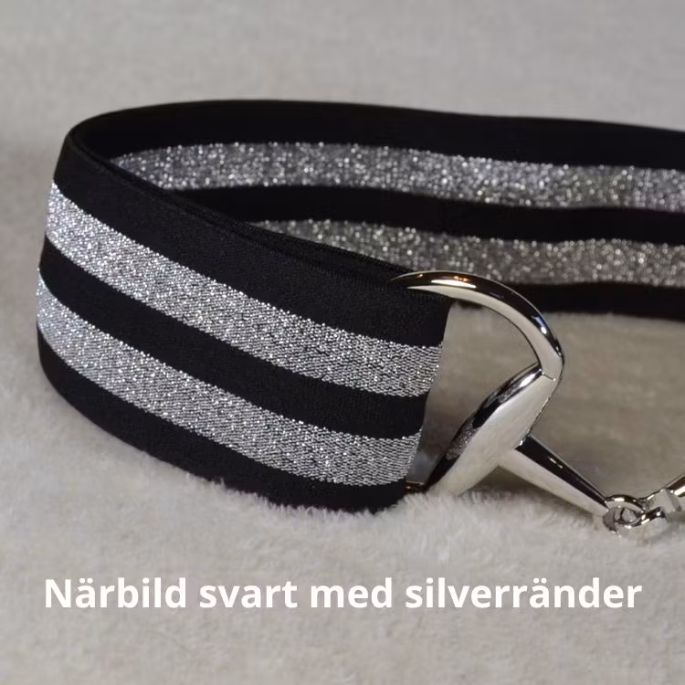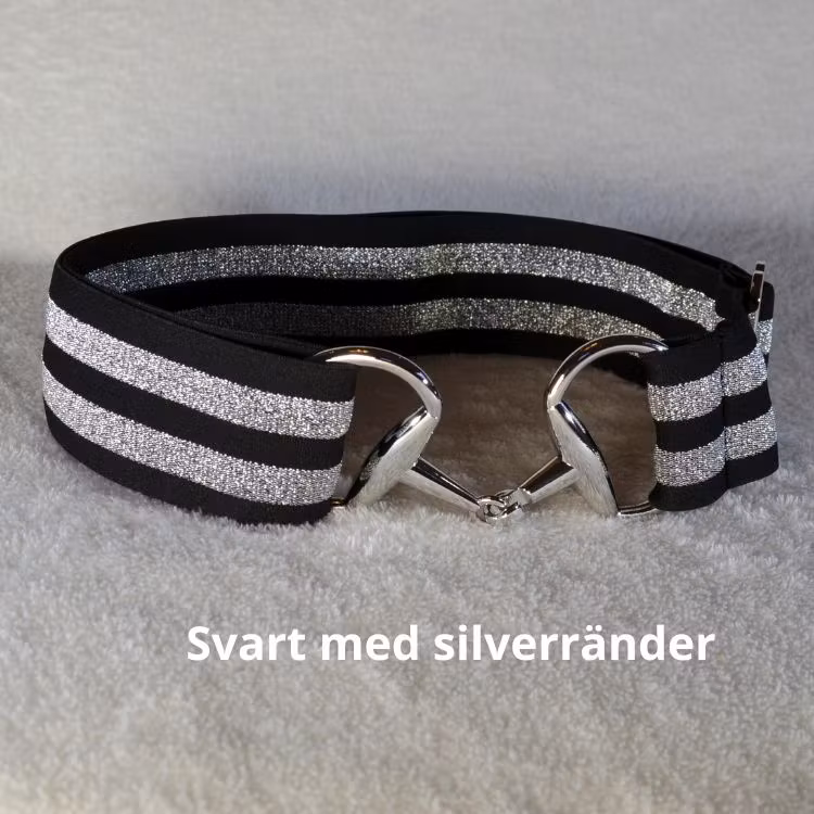 Svartrandigt med glitter i går aldrig ur tiden och med snyggt spänne i guld eller silver ger det en extra touch till vardags eller fest. Spännet öppnas enkelt på mitten. Passar lika fint att bära i stallet, på tävling eller varför inte till ett par kostymbyxorna på i skolan eller på jobbet. Det ger en hint om ditt intresse utanför stallet i vanliga vardagslivet.