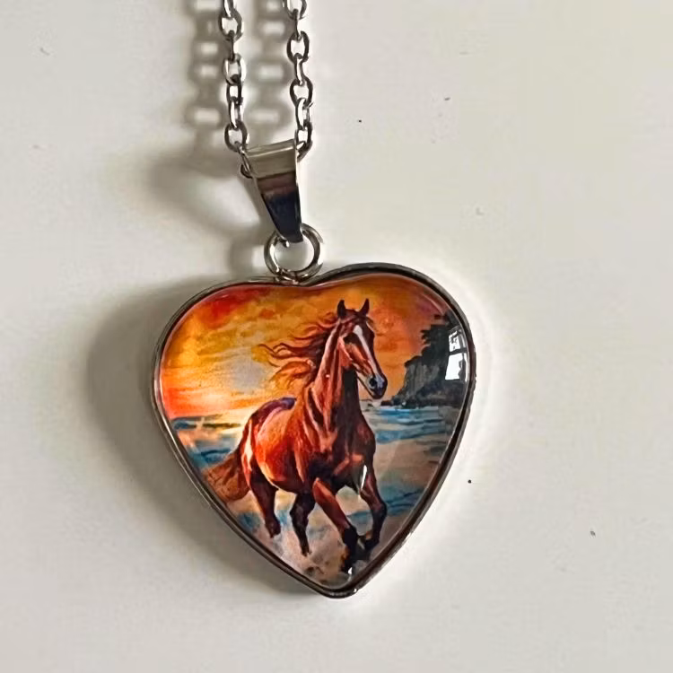 Fint halssmycke i form av ett hjärta med vit sagohäst och med ett fint budskap på baksidan. Smycket är tillverkad i zink och glas.