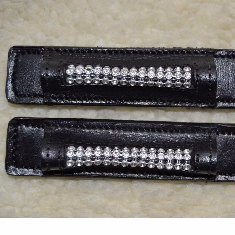 Sporrskydden är svarta och på utsidan av sporrskydden sitter det vit strass som blänker fint i solen. Sporrskydden ger ett elegant intryck och lite extra bling i ryttarutrustningen.