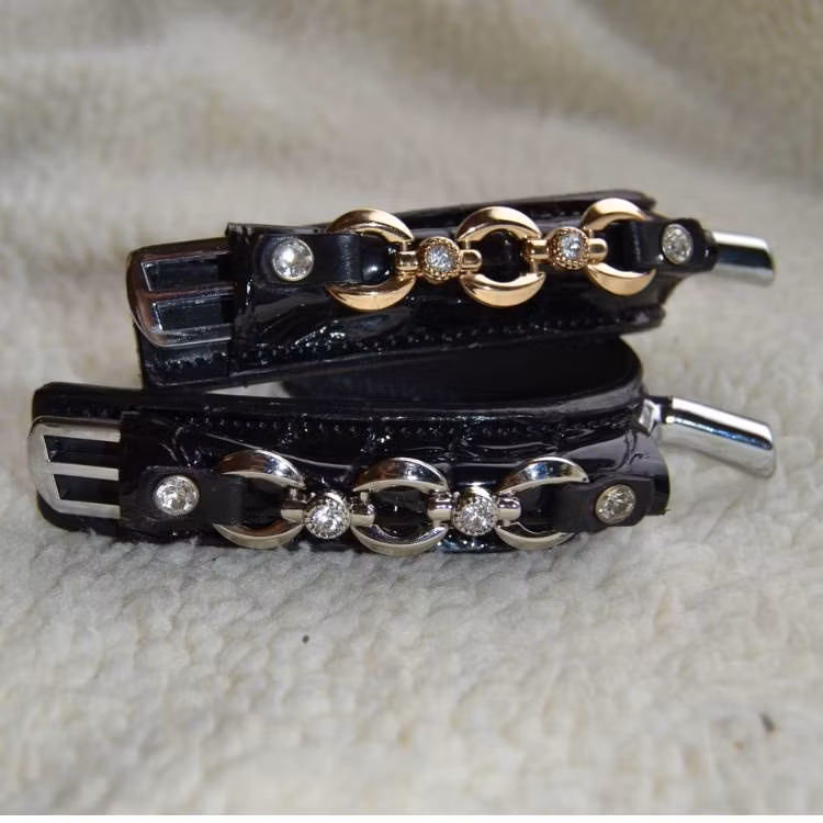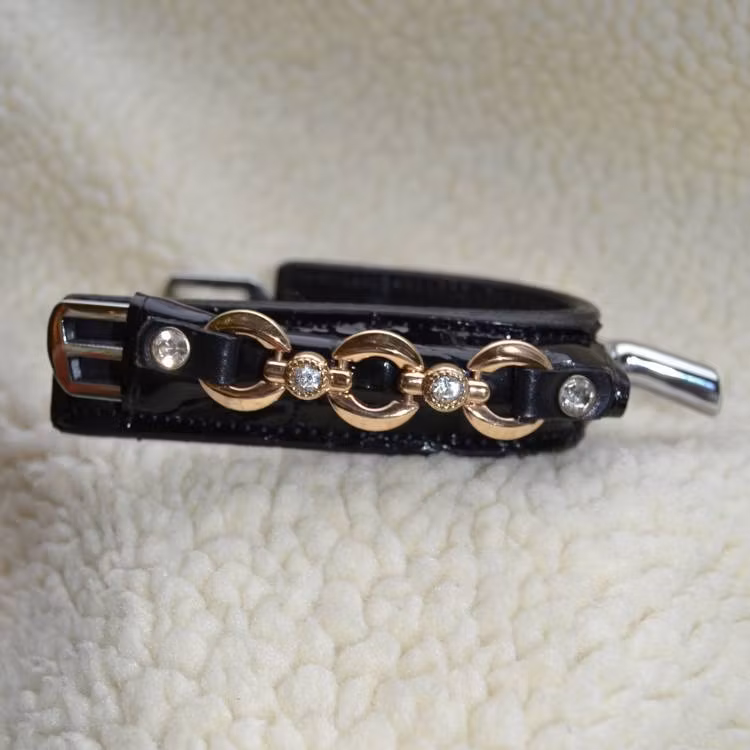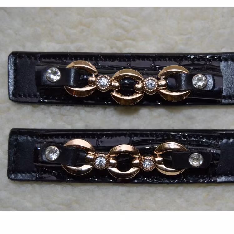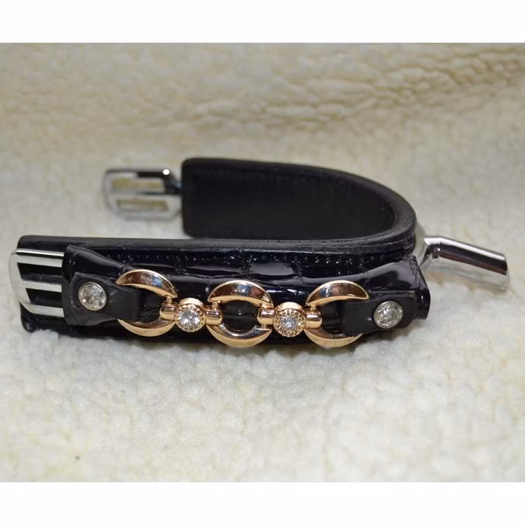 Eleganta svarta sporrskydd med strasskedja i guld eller silver. Snygg detalj som glittrar i solen - matcha med sporremmar för komplett stil!