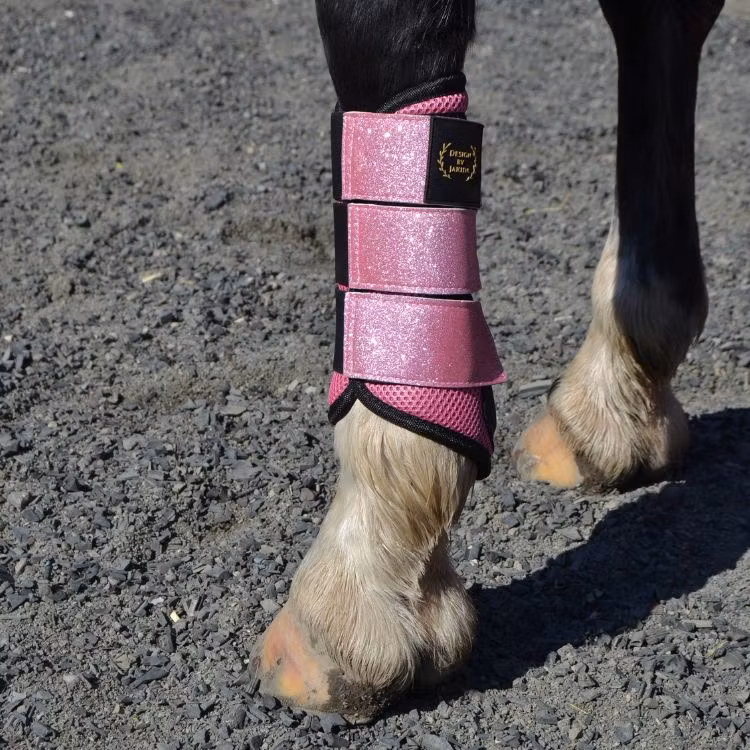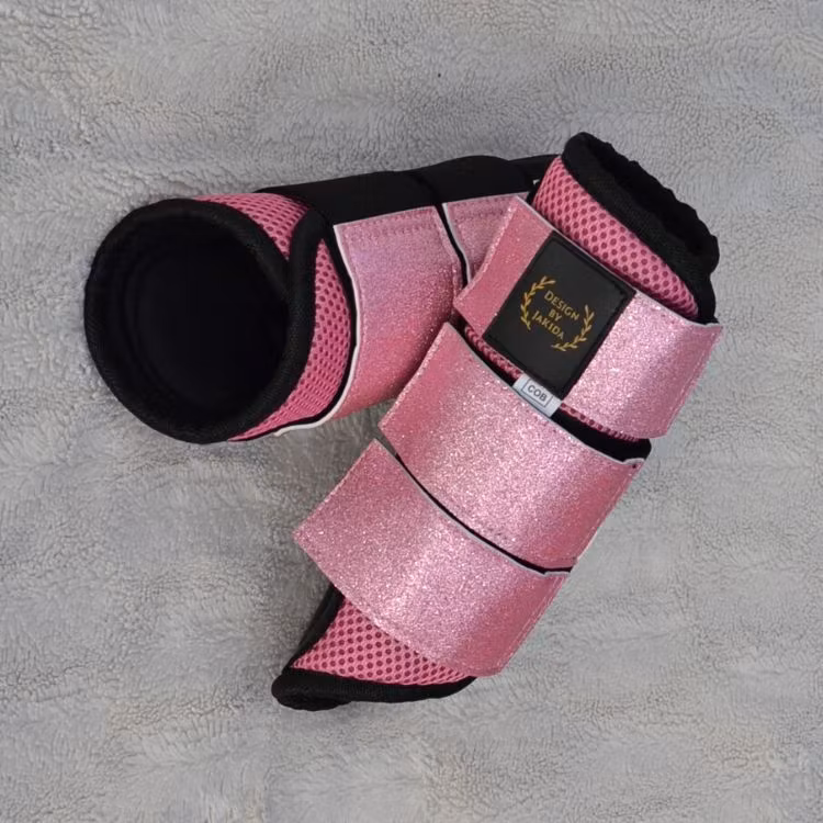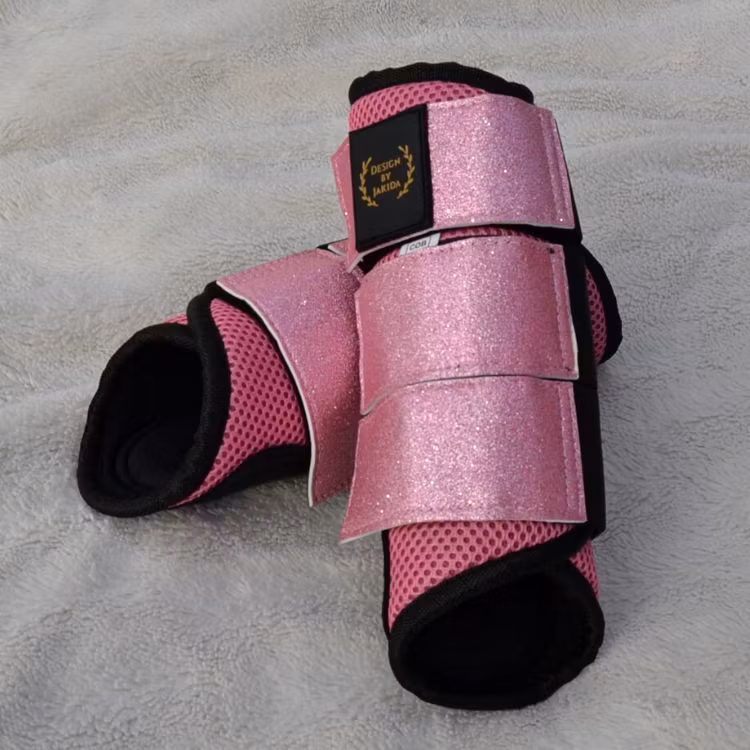Galet fina rosa benskydd häst som är tillverkade i välventilerade Mesh-tyg. Vilket minimerar risken för att hästens ben skall överhettas vid hårda träningspass. Försedda med härligt glittriga spännen som ger en gnistrande intryck när man rider.