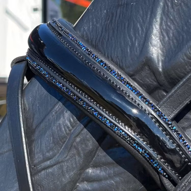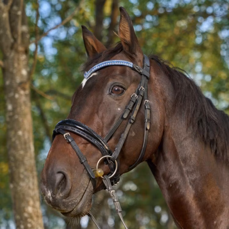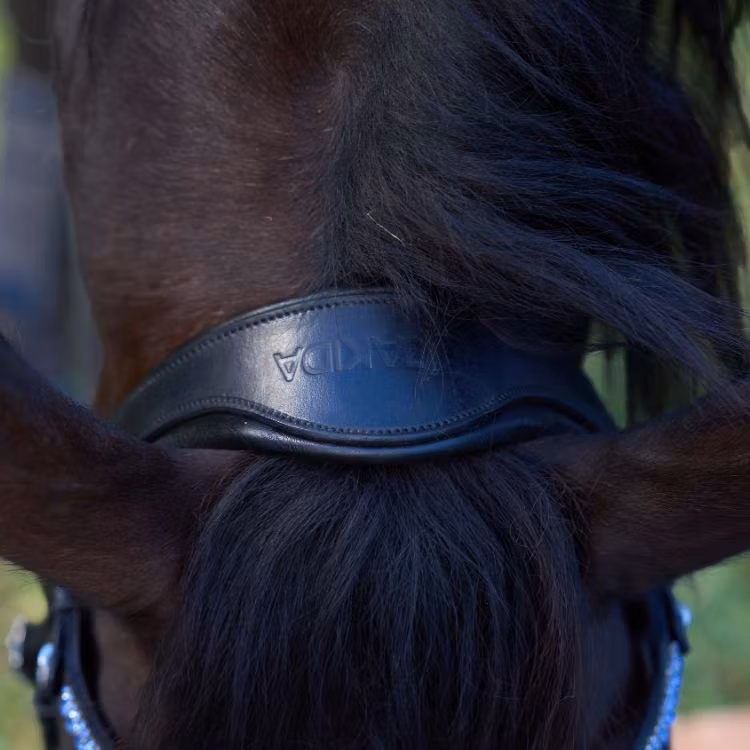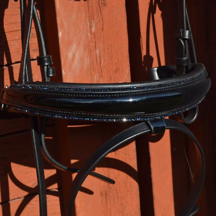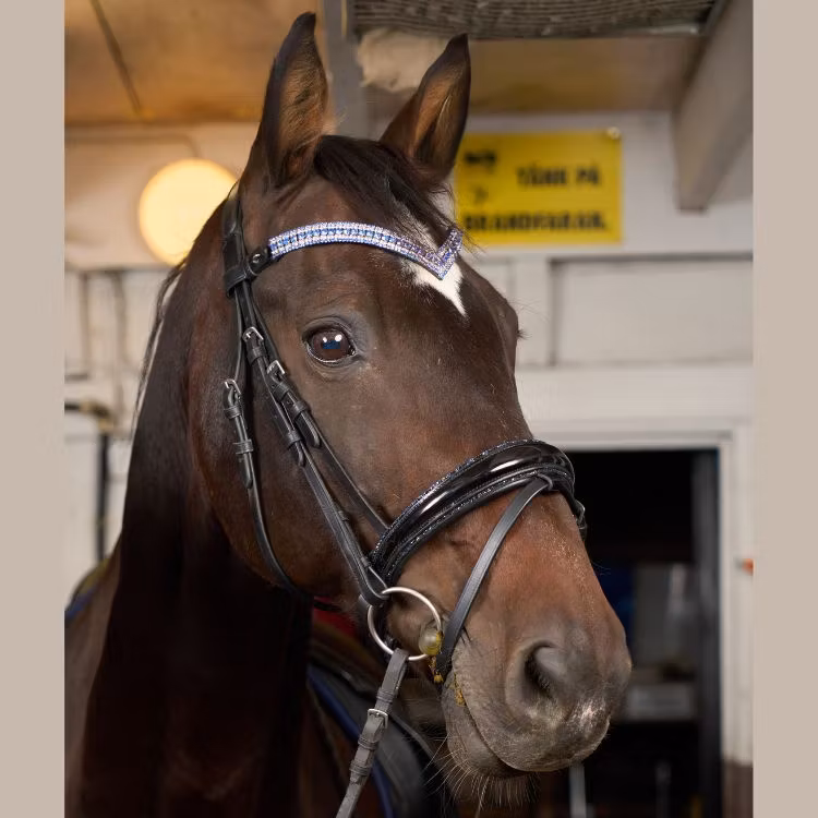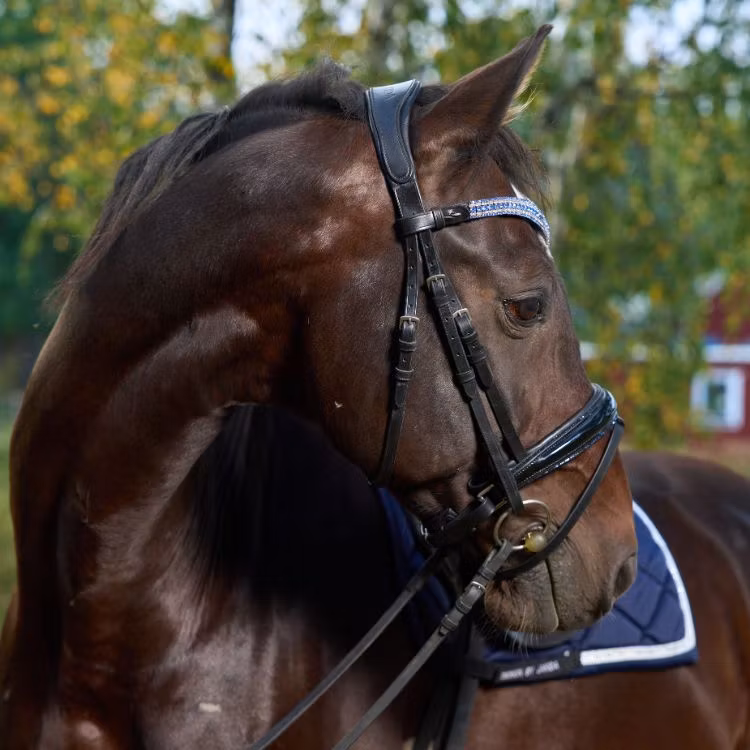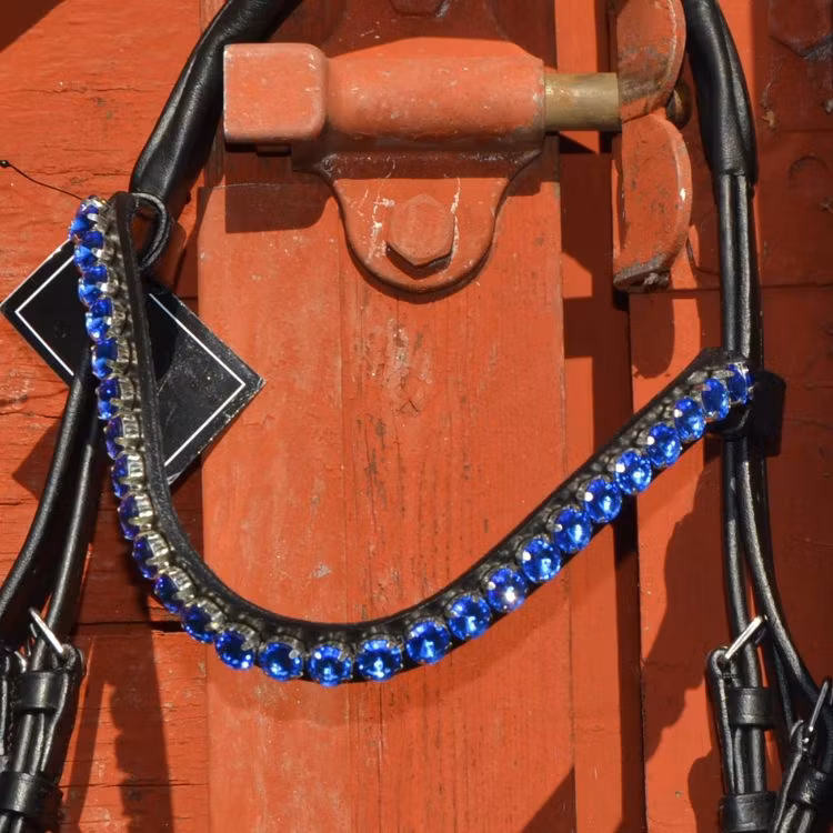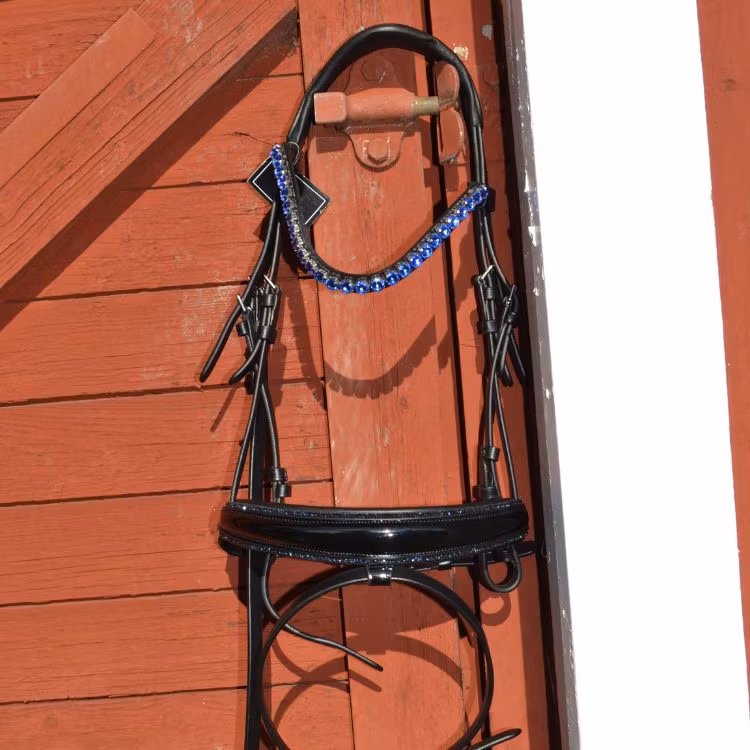 Ett träns som är bländande fint och som definitivt syns. Nosgrimman är svartlackad och längst kanten sitter det en blå strassrand. För komplett utrustning matcha tränset med våra mörkblåa benskydd och blåa glitterboots. Nackstycket är väl vadderat och atomiskt utformat för att ge hästen bästa komforten.