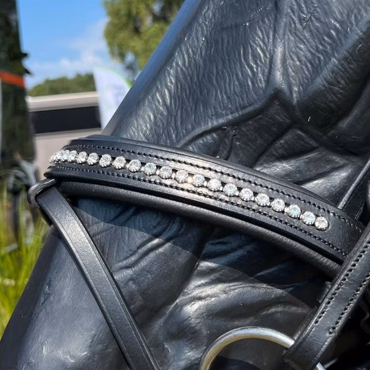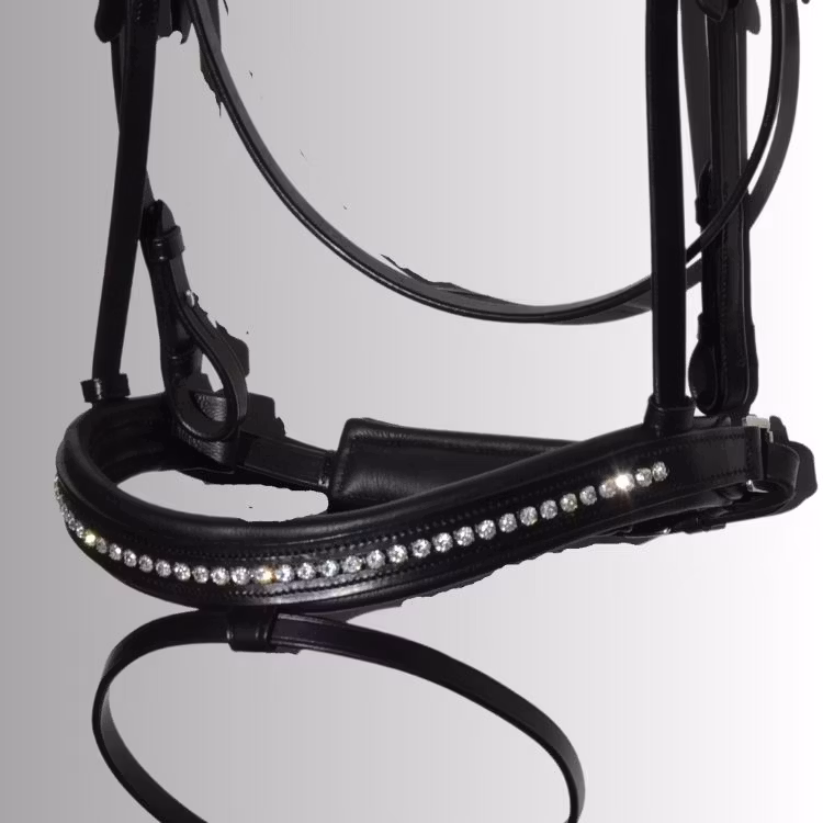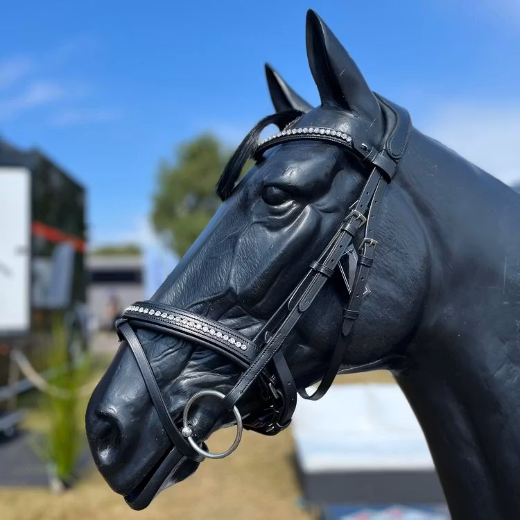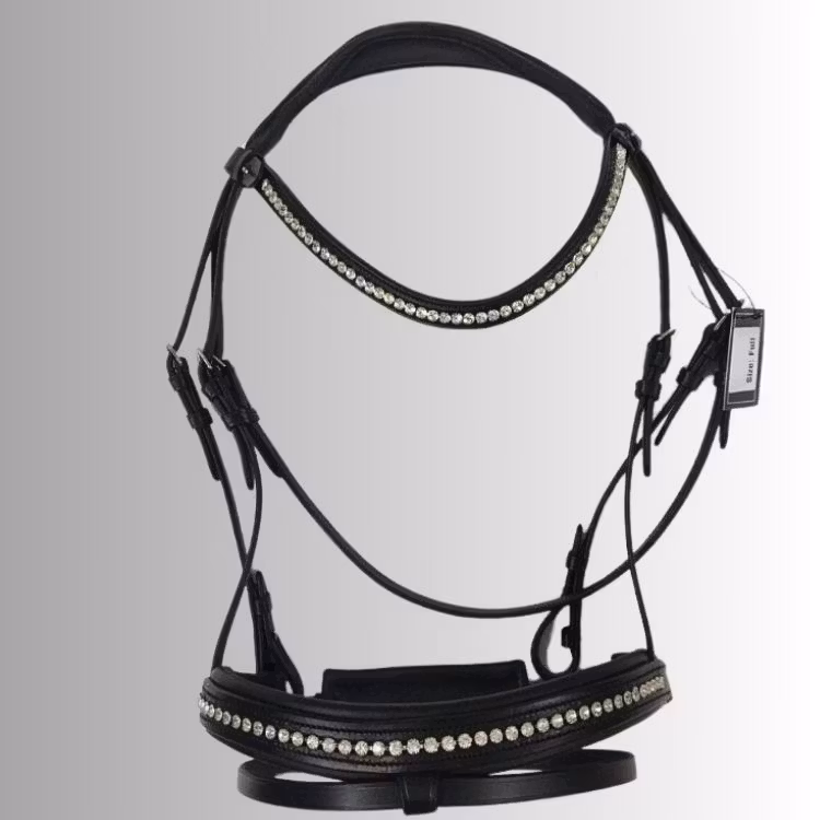 Elegant svart strassträns med infälld strass i både pannbandet och nosgrimman. Strassen gnistrar otroligt fint i solljus och ger ett mycket exklusivt intryck. Strasspannbandet är försett med öppningsbara ändar med säkerhetskrokar som aldrig kan gå upp under ett ridpass. Ger ett snabbt och enkelt byte om man önskar byta till annat pannband med smidiga snappknäppen. Nackstycket är anatomiskt utformat och fodrat vilket ger hästen en skön och behaglig känsla. Nosgrimman är mjukt fodrad och försedd med tillbaka knäppning för att ge bästa passformen.
