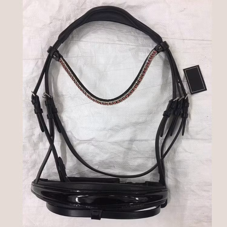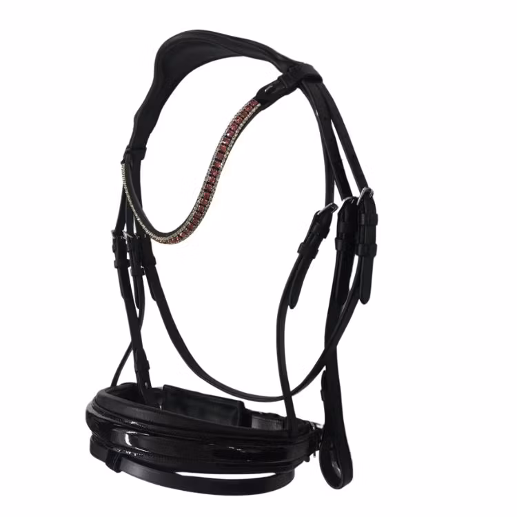 Svart träns svartlackad nosgrimma. Alla våra fina träns är försedda med fodrade nosgrimmor och alla nosgrimmor stängs med tillbaka förslutning. Det gör att tränset formar sig fint på hästen och sitter bekvämt. Genom öppningsbara strasspannband så kan Ni snabbt och enkelt byta ut pannbandet. Det öppningsbara pannbanden är försedda med säkerhetskrokar som inte kan gå upp under ett träningspass. Alla våra nackstycken har en anatomiskt design för att kunna ge hästen den bästa förutsättningen.