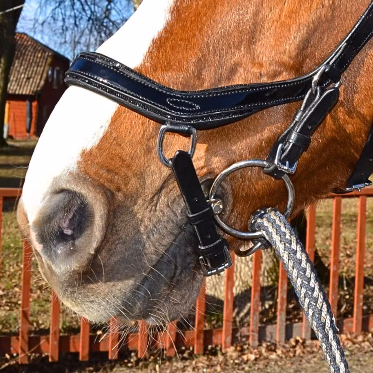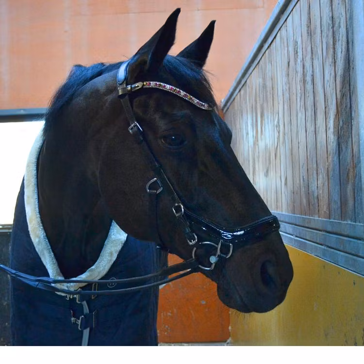 Marknadens snyggaste Micklem träns i mjukt formbart läder. Svartlackad Micklem nosgrimma som ger ett otroligt exklusivt intryck med sin svarta strasskant längst den svartlackade kanten. Med strassnosgrimma blir Micklem träns något helt annat än i sitt vanliga utförande.